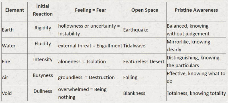So if you look at the earth dakini you’ll see that, first its location at the earth center. Then there’s the inflexible rigidity, the underlying feeling of hollowness or uncertainty. Then the instability, earthquake, the grasping and then the imprisonment that comes from the holding. Then you let all of that be imbued with lights so it dissolves into light. The jewel appears, the sense of stability and pristine awareness.